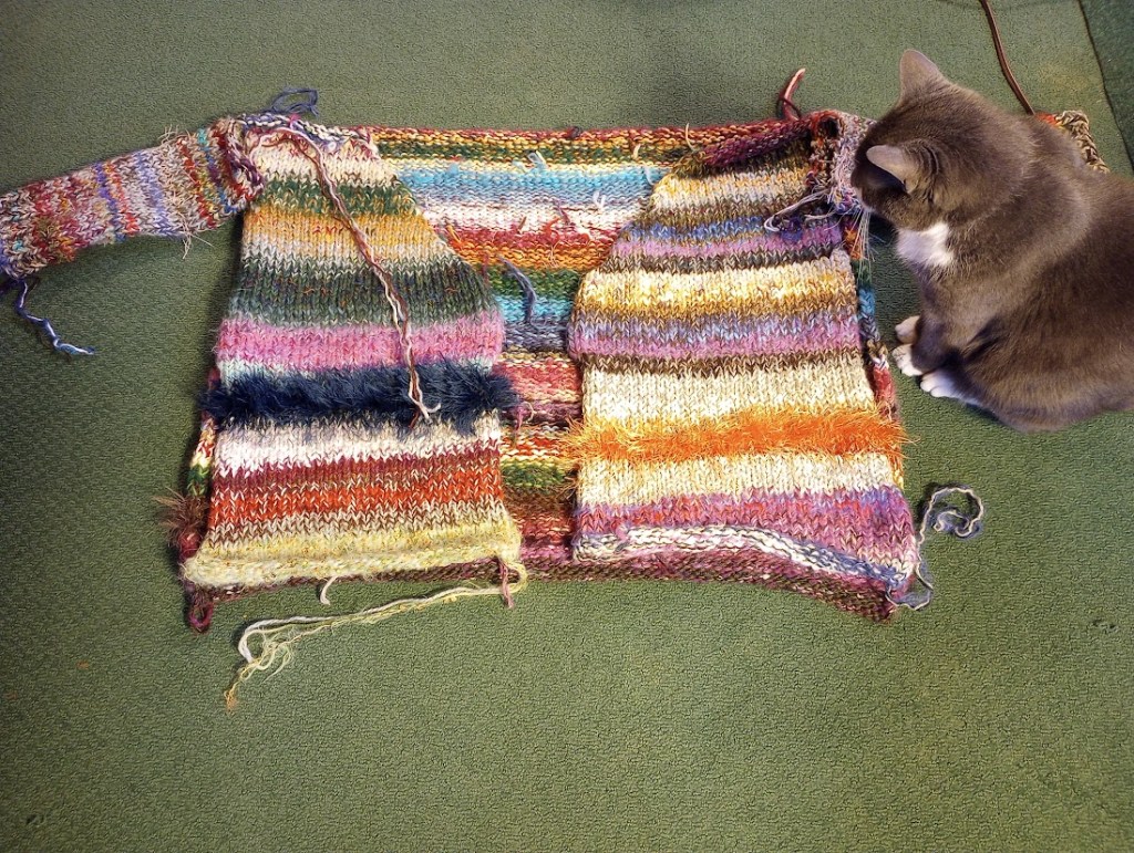 Here’s the thing: I made some adjustments to the pattern thinking it wouldn’t affect the outcome much. It’s been two years, so Bagger no longer has the free pattern on her IG page, so I couldn’t use it even if I tried. My idea to create two panels with slight decreases at the top simply didn’t work. I put it all together this morning, and I hated the shape of it. I’ve never made a sweater before, and I have been hoping that I could just make a lovely messy thing that I would love to wear.