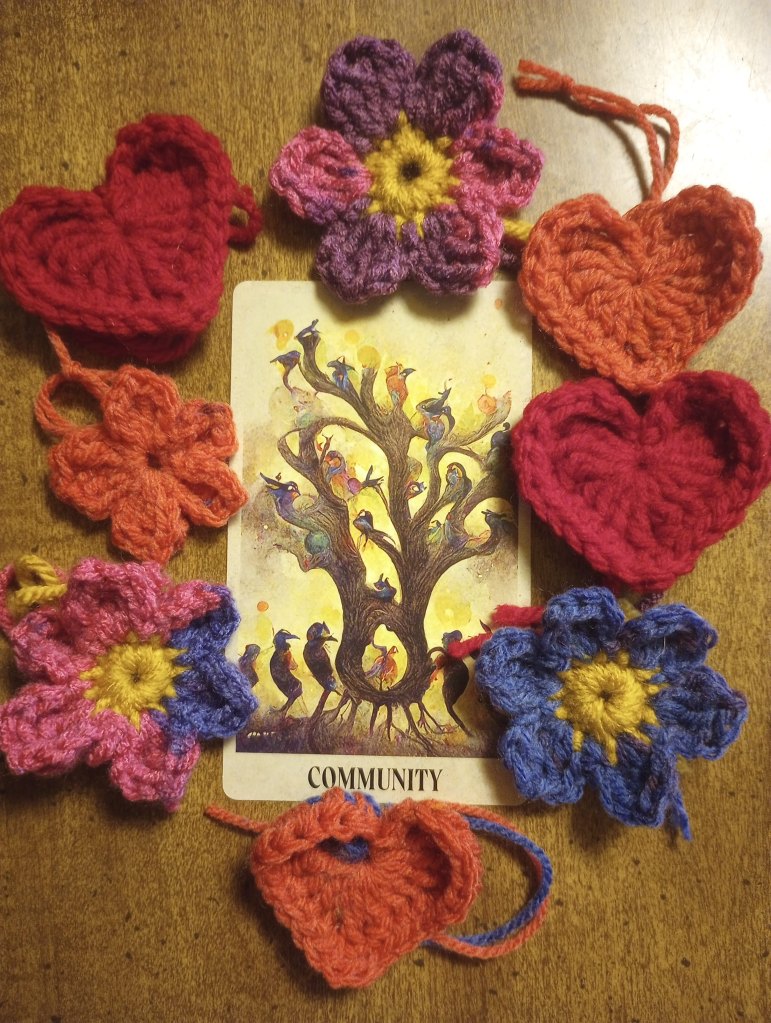 With all the busyness of the day, I only finished eight hearts and flowers. I arranged them around the Community card from the Between Worlds Oracle, because community was the name of my game today.