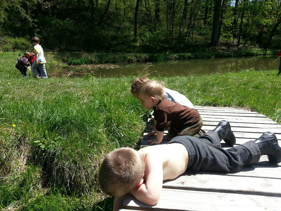 4. Nearly a dozen small boys and a girl playing at the pond and in the creek, catching polliwogs and crawfish and little fish, moms talking and picking watercress, Golda the giant koi swimming up to see what was going on.