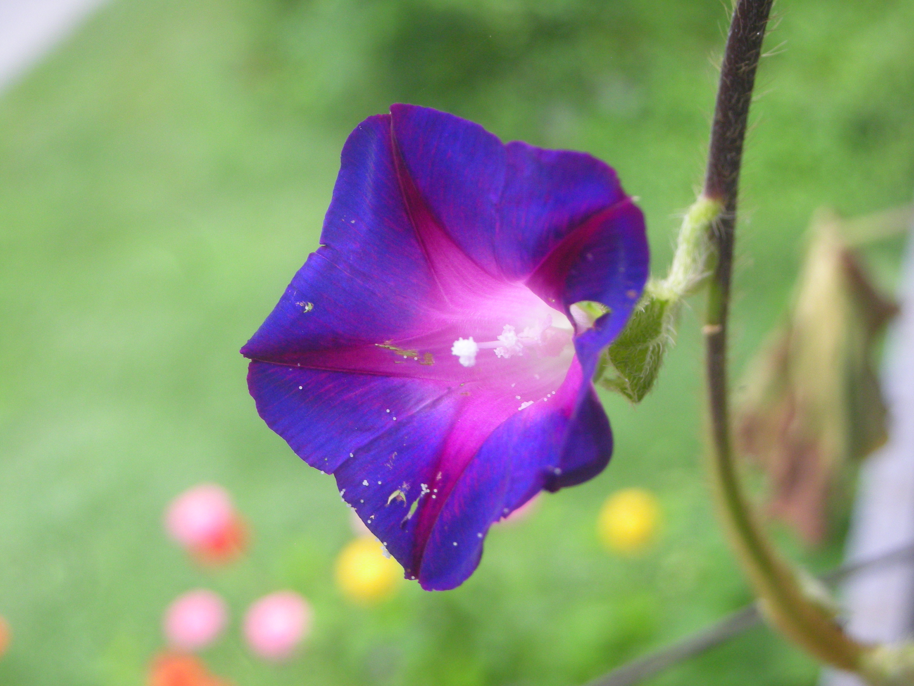 The morning glory that blooms more than a week after the vine has been cut off. And spiderwebs everywhere.)