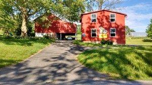 Then, blue sky in the space between the red barn and the poplar and sycamore trees. Even the sleepy walnut in the background is beginning to put on her summer clothes.