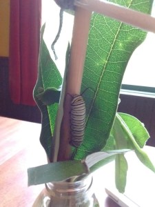 I came in the house at about 1 in the afternoon to find the caterpillar’s skin (that black thing on the leaf above the chrysalis–I put it there so I could have both in one picture) on the counter, and the emerald jewel of the chrysalis hanging there. How is that possible, that this oblong jewel was inside that caterpillar skin? And now for complete transformation: Her insides will dissolve into goo while her wings form and she takes her new shape.