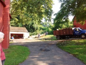 By ten on Wednesday morning, the trunk was down, and the crew commenced to saw it into sections, carting away several dump truck loads. The lawn was completely torn up–they clearly tried very hard to be careful, but it was impossible on that wet ground not to make mud.