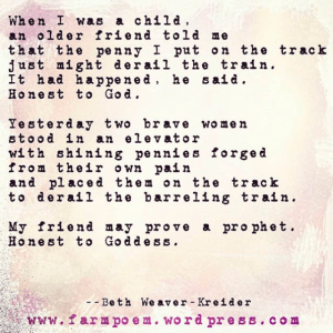 And as for power, as some wise woman wrote on her protest sign: We grab ’em by the midterms. We empower women and people of color. We stump and rally and canvas and speak out for women’s voices and women’s leadership. We amplify the voices of black women, of Latina women, of trans women, of immigrant women, of women in wheelchairs and women with mental illness.  We listen to single mothers. We listen to teenaged women. We #VoteforHer. We #BelieveHer.