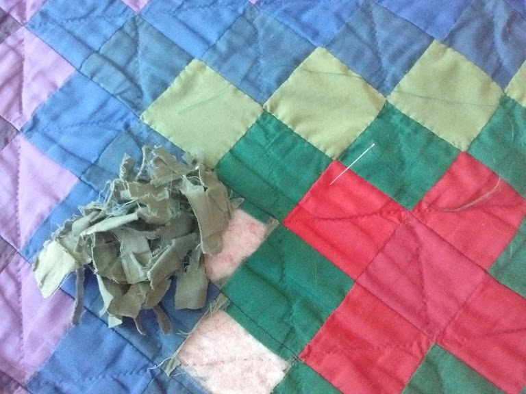 And it has indeed become worn and ragged, but only in one of its colors. The heathery olive green was apparently a less sturdy fabric than the rest, and over time, it became completely shredded. It was my intention to go to a fabric store and try to match the color exactly, but I just don’t ever seem to find the time to make excursions like that, and so I put off fixing it for a couple years. Finally, during lockdown, I began to wonder why I was so attached to the replacement color matching the original exactly. I had some green with the same intensity of vibrancy as the other colors in the quilt. So I cut some patches and started to cut away the old and tattered fabric. (I didn’t think to start photographing the process until I had already repaired eight of the patches.)