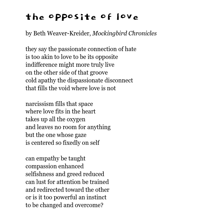 I think I’ve hit the mid-month slump in poem world. I can’t seem to get into the poem zone. I feel like the last few have been toss-offs, but I’ve been startled how much I like them when I come back to them half a day or a day later. Here’s another. The prompt was love/anti-love: