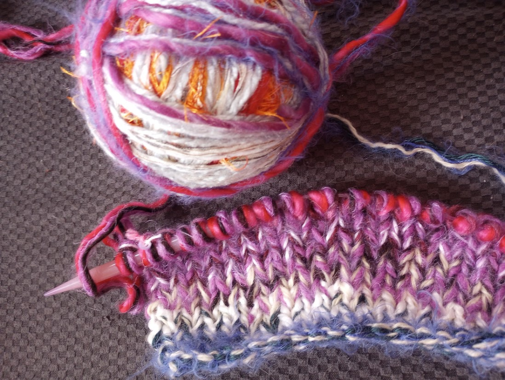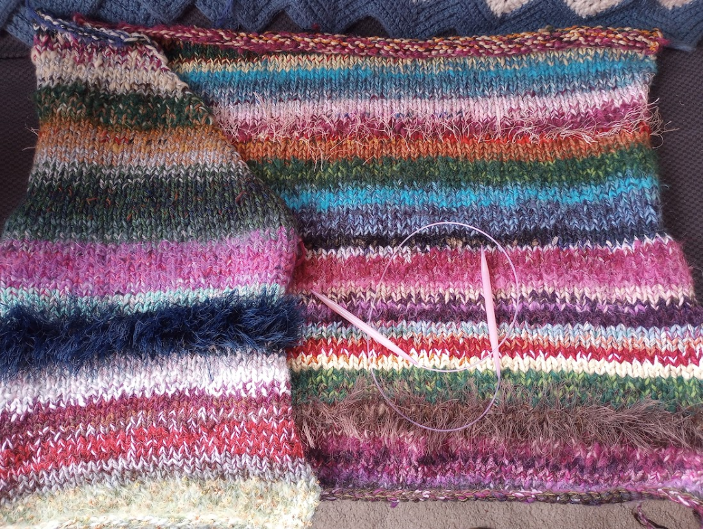 The first photo shows the two completed pieces (of five) of the Alone Together Sweater I began in 2021 when I was in Covid Quarantine. I completed it about a month ago, and unraveled it because the sizing was way off. The second attempt (ATS 2.0) is less wildly wonky, but still wacky, but in a satisfying way.