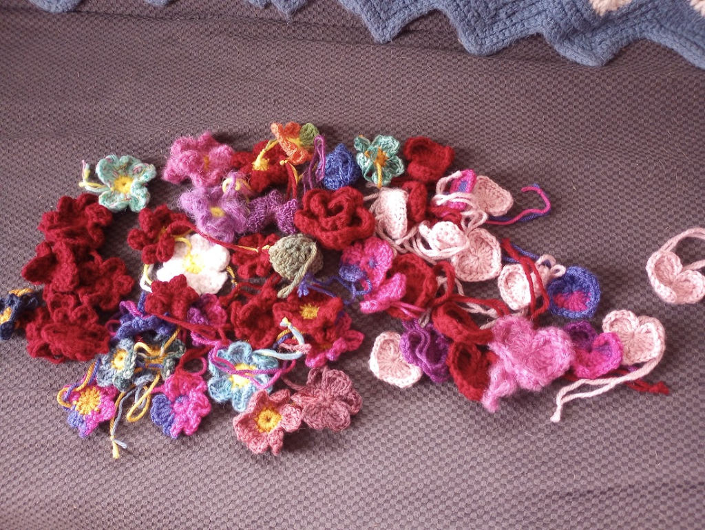 Then I sewed in the loose threads on several flowers for Pride. I have 53 ready to go. I think I’ll want to increase my goal number from 200 to 400.