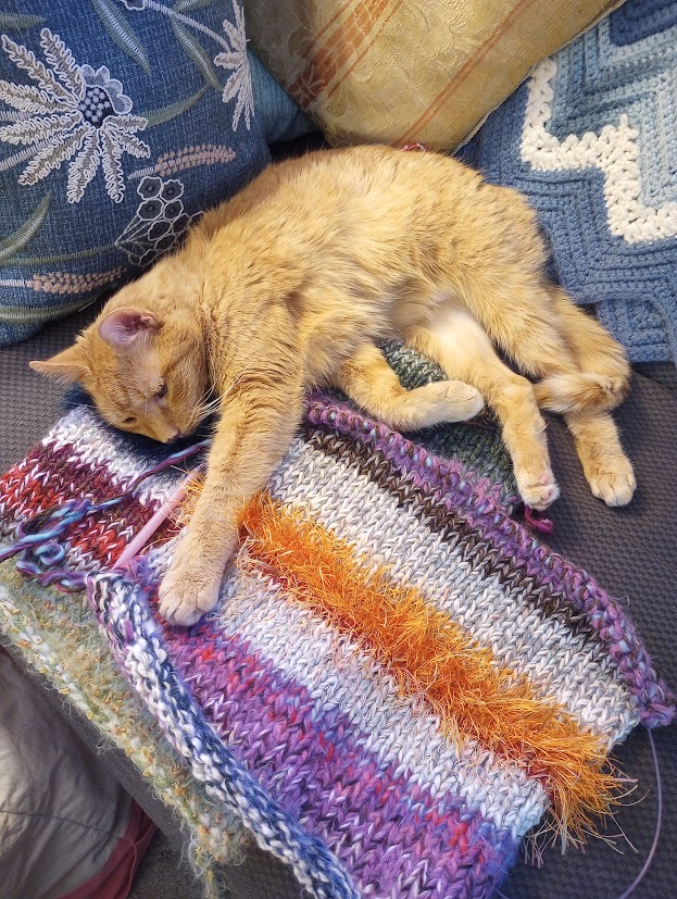 The Alone Together Sweater was designed during the pandemic by Lærke Bagger, a wildly creative out-of-the-box textile artist from Denmark (look her up on IG). In her directions, she gave permission just to knot yarns together. The idea was that since we couldn’t go out shopping, we needed a way to creatively use up our stashes, using two or three strands at a time, giving the feeling of impressionistic painting with yarn.. Her original construction was a back, a front, and two arms. After my initial sweater was too wonky, I decided to divide the front into two pieces to make a v-shaped neck. I might make it a cardigan or I might stitch up the front.