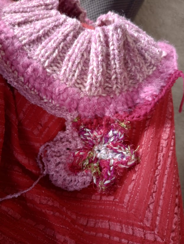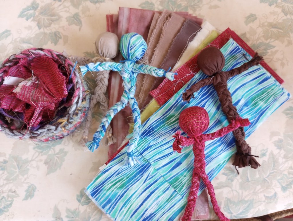 I spent some time today organizing some scrap fabrics, cutting pieces for the 20 little dolls, and braiding up a couple little people. I’m also playing with free-form crochet on a neck-piece.
