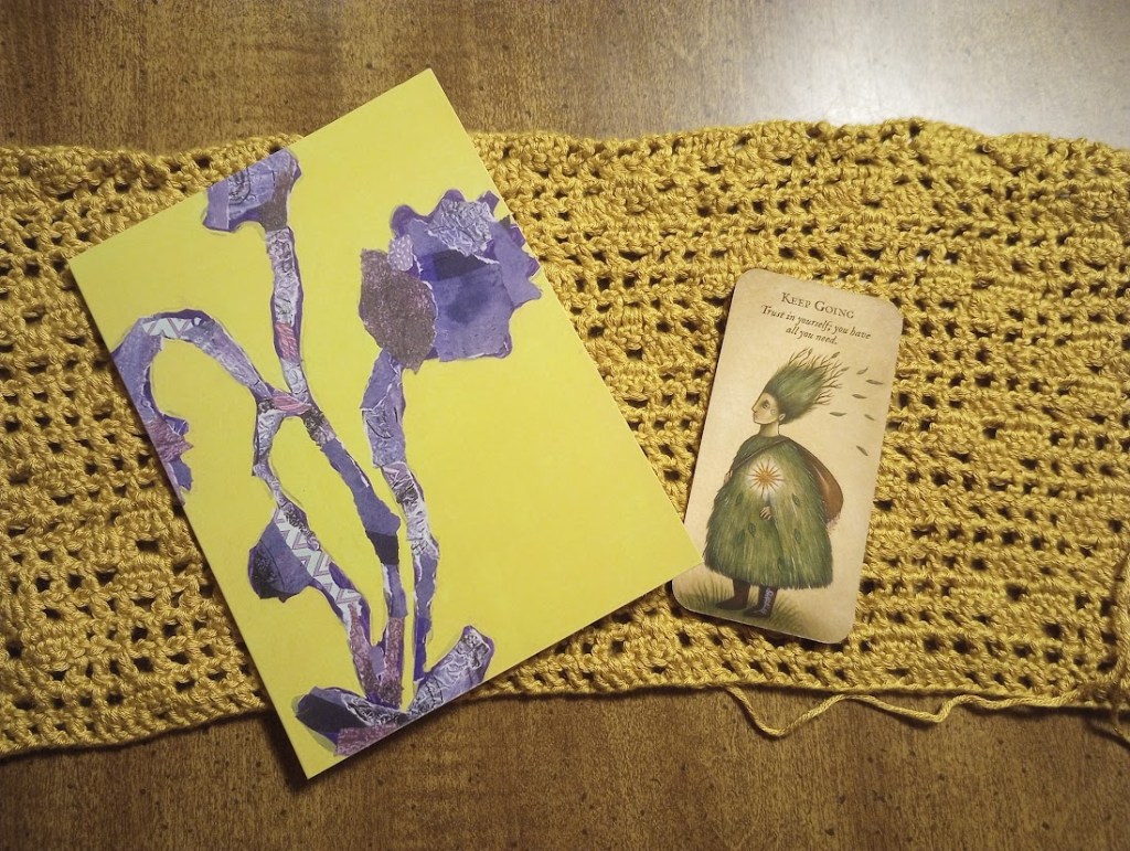 More rows on the yellow section of the bamboo shrug today, a Forest Fae card reminding me to keep going, and a thoughtful note of kind words from a friend.