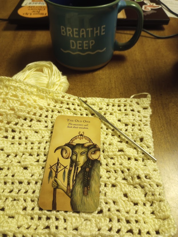 About five rows tonight. And a card from the Forest Fae deck by Nadia Turner: The Old One. The ancestors call. Seek their wisdom.