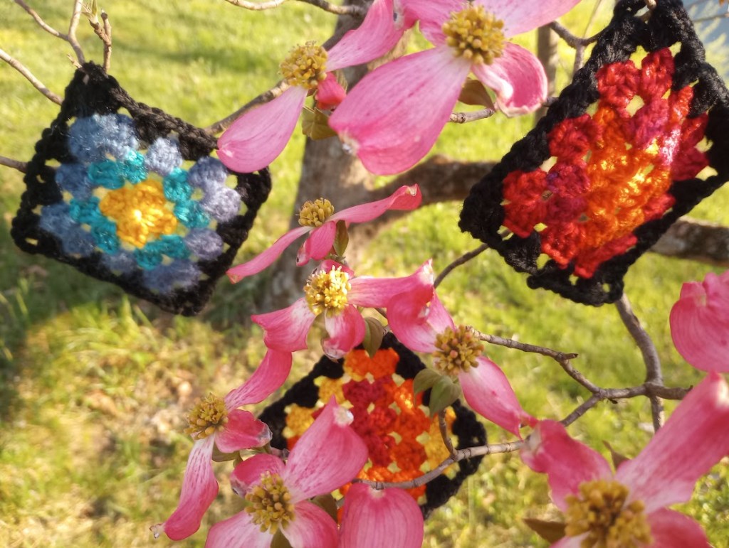 Busy day with a few bright moments to breathe in the flowers and drink a cup of tea with beloveds. Three granny squares and a tiny poem.