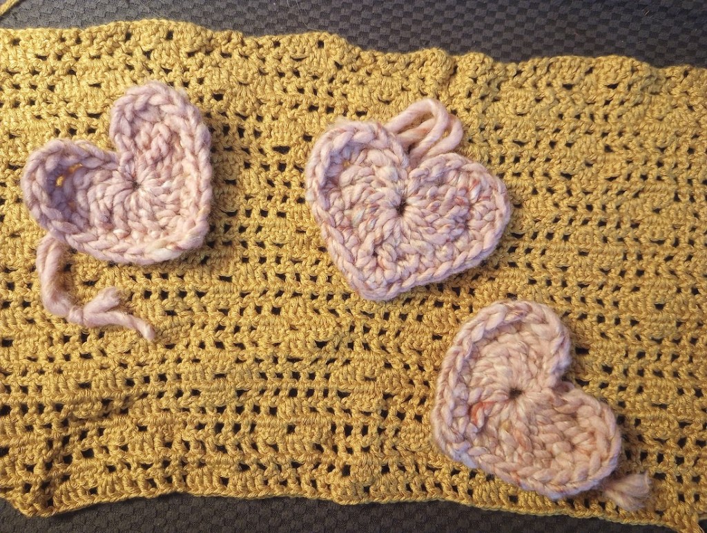 Today’s Project Work: A few more rows on the yellow piece of the shrug, and three pink hearts.