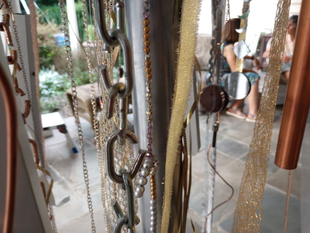 I can’t seem to get my video of the Cosmos Wheel to load up here. I can’t do justice to Cosmos without the sound. Wires and bits of chain, energetically charged pendants and pieces, a tiny round piece of meteorite that my brother found in Tanzania when we were kids, prisms and crystals and chiming pieces of metal.