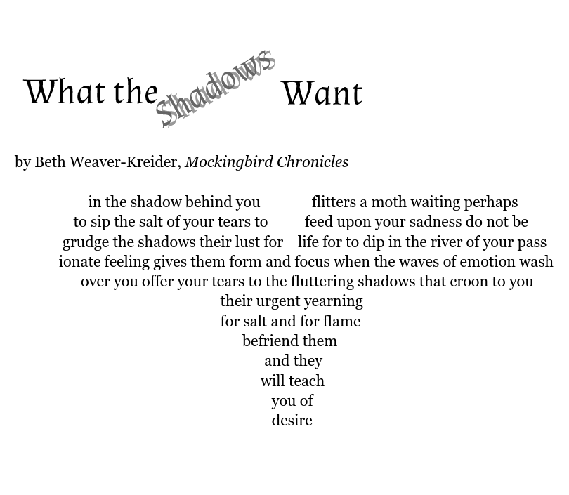 Today’s prompt (Robert Lee Brewer at Writers Digest) is to write a shadow poem. Today I went a little more concrete in the sculpture of the poem. It’s not quite a moth, but not quite not.