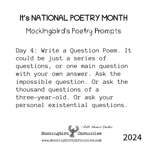 Today is the last day of National Poetry Month. It has been another marvelous month. I have felt like the Muse was active more days this month than not, for which I am grateful. I never know when I begin these things whether I am going to hit a wall by day ten and have to slog through to the end. I’m grateful that there was so much to find and follow this month.