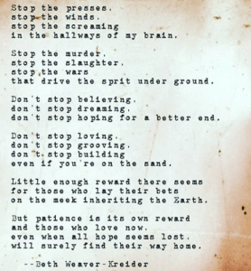 Today is the last day of April! I love the adrenaline of poeming in April, always a little jittery, not sure I can pull anything out of the old noggin. But oy, am I ever glad when it’s done. I imagine it feels a little like finishing a marathon, though I wouldn’t know anything about that. Today’s Tuesday double prompt on Poetic Asides is to write a Stop/Don’t Stop poem.