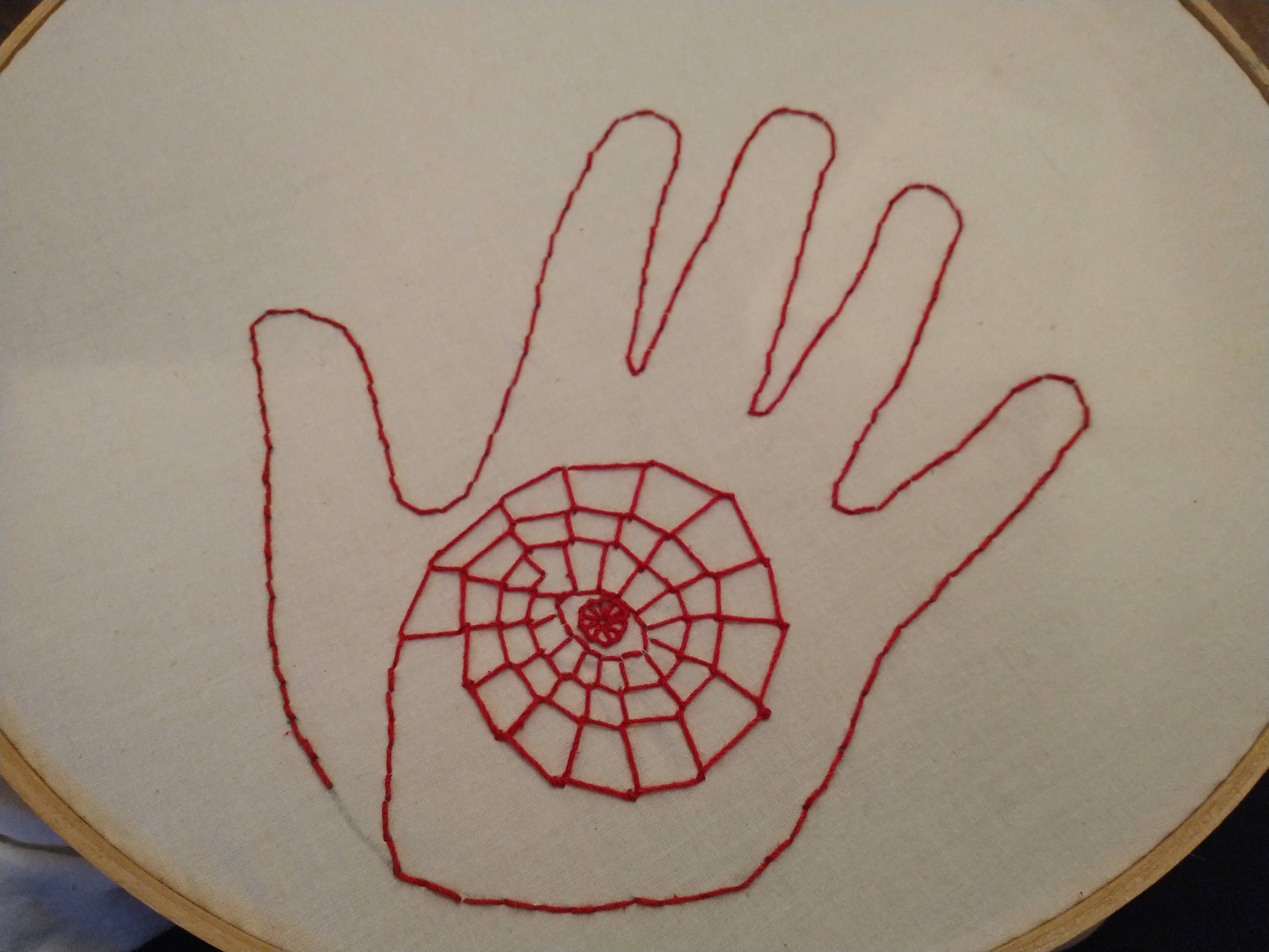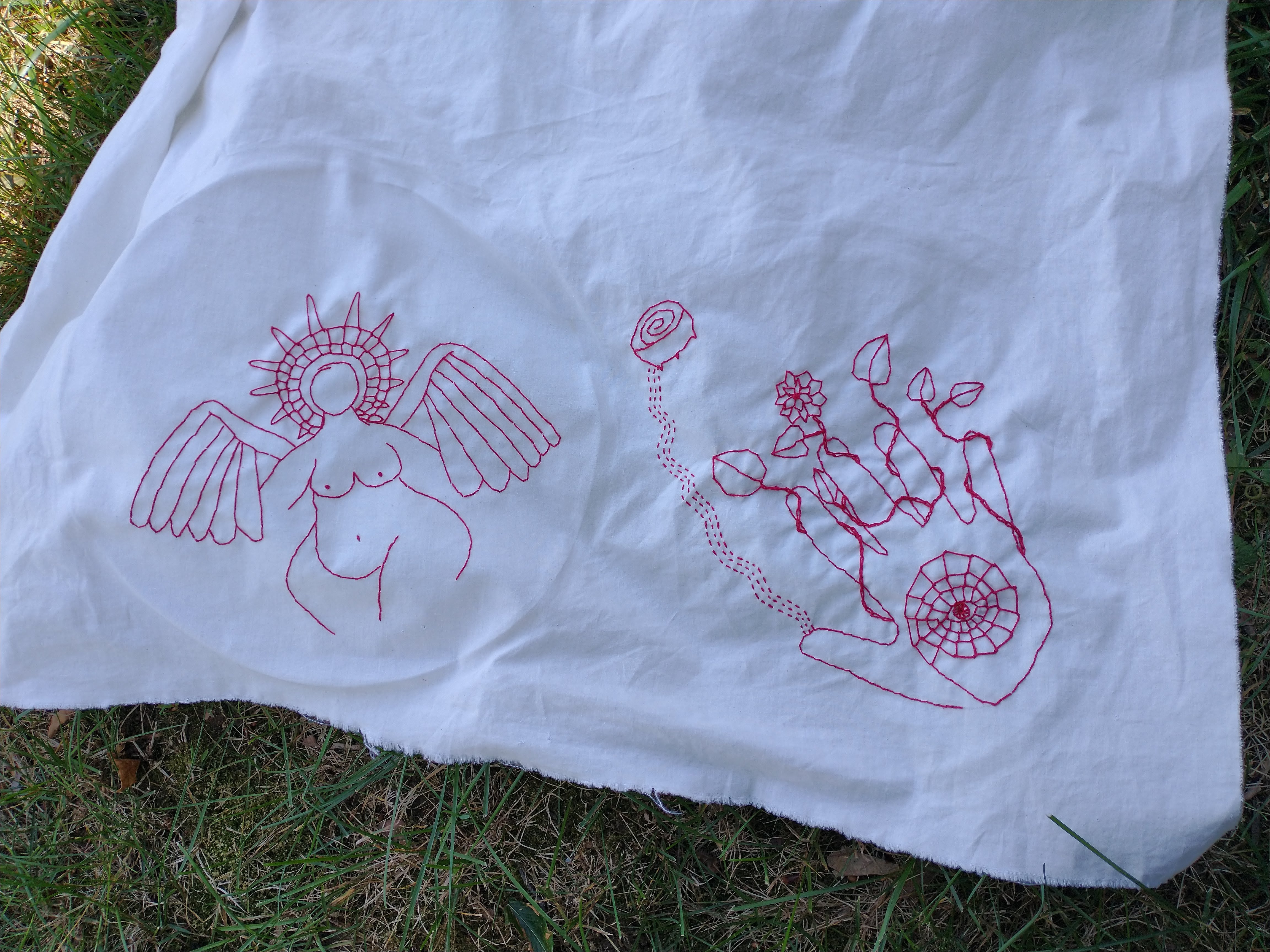 I took along a white cloth and some red thread. I have been inspired by several instagrammer embroiderers to begin to create a story cloth, something that’s not specifically functional, but is more of a journal, a dialogue with my inner self. On one of the first days there, I was meditating on something I’d read, a Buddhist idea about the base of the spine being where the three rivers meet. I began to consider what my three rivers are. Along with embodiment, I received creativity, and magic/mysticism. So I began embroidering the flowering hand image I found framed on the wall–for creativity. Then I embroidered a full body–my body–with wings and a crown, to represent embodiment, being alive within this body. And later, I embroidered my stump, the center of my current magical work, representing the inner work and the spiritual connection to the Source of All Life. All three are connected to a center cauldron, which is the place where the three rivers meet. Other images above include some collages I made while meditating, a painting (“You can become all flame,” said the ancient desert abba), and the back of my #alonetogether sweater, which I completed during retreat.