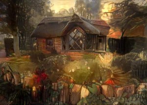 When the stress of the everyday gets too stressy, I begin to fantasize about what my little witch-poet’s cottage might look like: thatched roof and cob walls, a nice big window, sunflowers and poppies and blue-eyed chicory in the garden, and a bee skep on a bench. Inside, a fireplace and bookshelves, cabinets to hold stones and papers, birds’ nests on the mantel, a comfortable recliner and a writing desk. (Somehow, in the filtering process to modify this photo, my gnome-friend Solomon Shandy appeared in the photo. He’s in the lower left-hand side of the photo–can you spot him?)