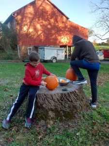 We got a late trick or treat start, so I didn’t get the obligatory photo in their costumes (we’re going to make them dress up for a photo shoot today or tomorrow), but here’s a pumpkin carving photo. Barn shadows are stunning in these autumns afternoons.