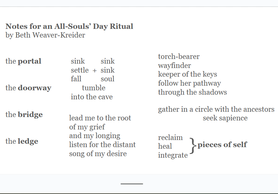 Gratitude List: 1. My parents are safe and well in their new apartment. 2. The way the light angles in during this season. 3. My incredible students–I love watching the seniors create and present their Local Legends and Lore presentations on our Halloween Trail every year. I had to miss it this year because of my parents’ move, but helping them prepare is always a highlight. 4. An extra hour of sleep tonight. 5. Rituals to mark the changing seasons (externally and internally) May we walk in Beauty!