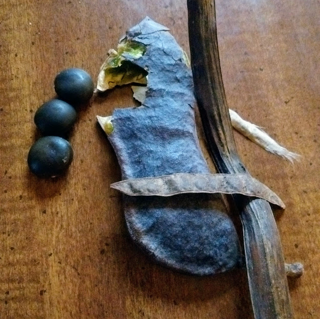 The large fat pod is Kentucky Coffee Tree. The round seeds came from that. The long twisty one came from a Catalpa, and the short one is a Black Locust pod.