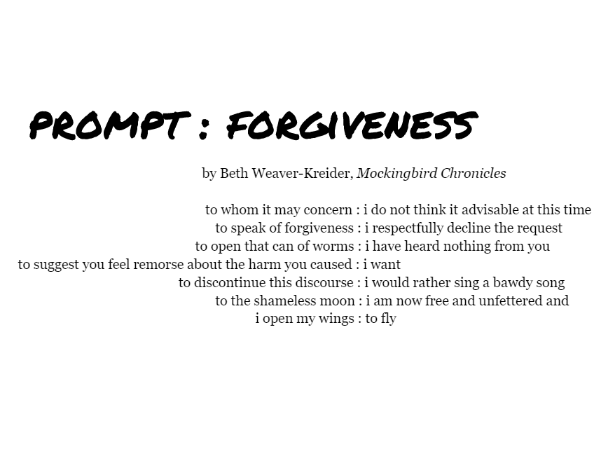 Now that I have finished my friend Tim’s seven Rilke prompts, I am heading back to Write Better Poetry, Robert Lee Brewer’s blog on the Writer’s Digest site. I like the old name of the blog so much better: Poetic Asides. Now all their blogs are Write Better _________. Bland and unpoetic. But Brewer is still a good one to follow. Today’s prompt is to write about forgiveness. Ever defiant, I chose to write about the opposite. Perhaps it won’t seem very spiritually evolved. . . I’m not too fussed.